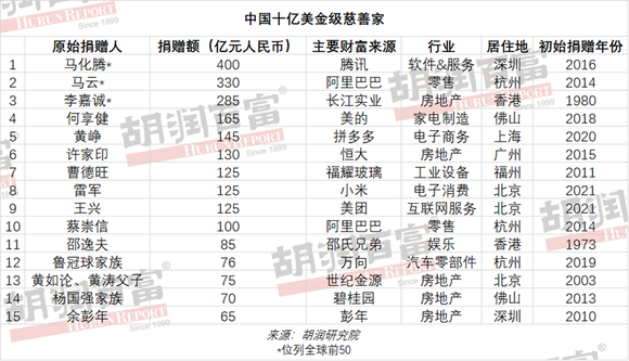 放眼国内,有15位中国慈善家在最近100年都捐出了10亿美金以上,其中12位在世,3位已去世。马化腾以400亿捐赠总价值位列第一,其他还有曹德旺、何享健、鲁冠球、邵逸夫,以及中国裸捐第一人余彭年等。