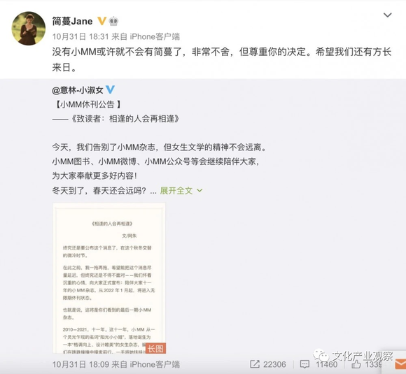 “今天,我们告别了小MM杂志,但女生文学的精神不会远离。”在10月31日《意林·小小姐》官方微博发布的无限期休刊启事中,总策划阿朱用了《相逢的人会再相逢》作为标题。宣告杂志将无限期与读者说再见。