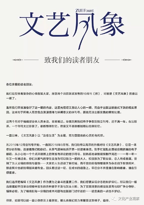 曾被誉为“现象级”精品杂志的青春文学类杂志《文艺风象》,在2018年成为了文艺青年心中永远的意难平。