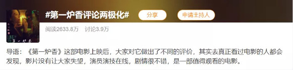 10月26日,一条#第一炉香问题出在哪里#的微博话题冲上热搜,短短数小时阅读量高达2.4亿,讨论次数达2.2万。从吐槽选角的“第一炉钢”到吐槽台词的“青春疼痛文学”,网友的 “狂欢式吐槽”甚至比电影精彩。10月28日,画风有所转变,“第一炉香评论两极化”冲上热搜,部分网友表达了电影并没有那么糟糕、应该避免跟风黑的观点。
