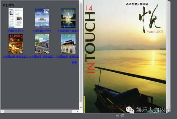 可能是因为孤陋寡闻的原因,也可能是年龄不搭的原因,娱乐大咖内参并不了解国内有一本《In Touch 悦》杂志。各方查询的结果,这可能是一本已经停刊了的双月刊,且就是冯嘉怡个人履历中所称的“凯悦酒店自己的杂志”。内参君找到了2005年的一期封面,下面的红色小字注明为“凯悦美食会增刊”。
