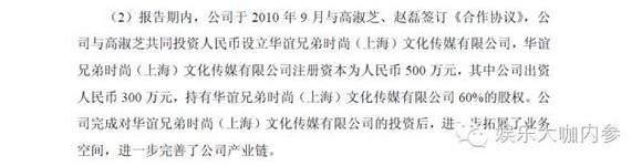 “结果电视剧没有投成,我们却变成了很好的朋友。” “华谊最初找我谈,说想扩展时尚行业,希望我加入,来帮助他们发展模特经纪。” 华谊兄弟2010年的年报显示,当年9月赵磊与华谊兄弟合资成立了华谊兄弟时尚(上海)文化传媒有限公司。年报中所称的高淑敏,内参君了解到的情况是赵磊母亲,由她代赵磊在公司持股40%。原因是赵磊持外国护照。