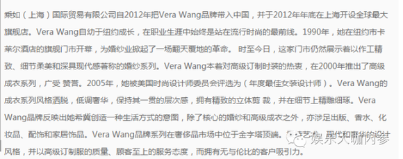 其中乘如(上海)国际贸易有限公司应系Vera Wang品牌的代理商,注册于2012年,赵磊在该公司担任监事。