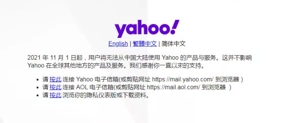 根据雅虎的公告,中国大陆用户只能从三个给定的链接访问雅虎邮件、美国在线邮件和隐私仪表版的数据。
