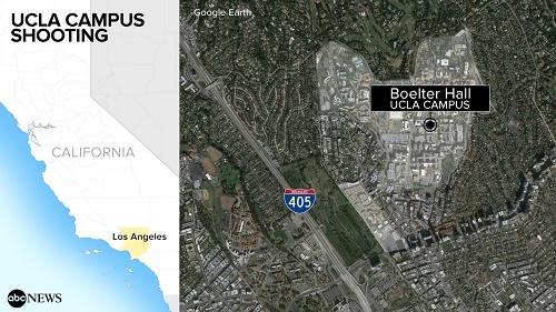 加州大学洛杉矶分校有学生超过4万名。事发地点位于该校工程学院博尔特大堂的一个小办公室里。事后,校园紧急封闭,气氛高度紧张。当时正是早餐时间,许多学生躲在就餐区,远离窗口。随后校方封锁了整个校园。数百人学生都躲在建筑物里。