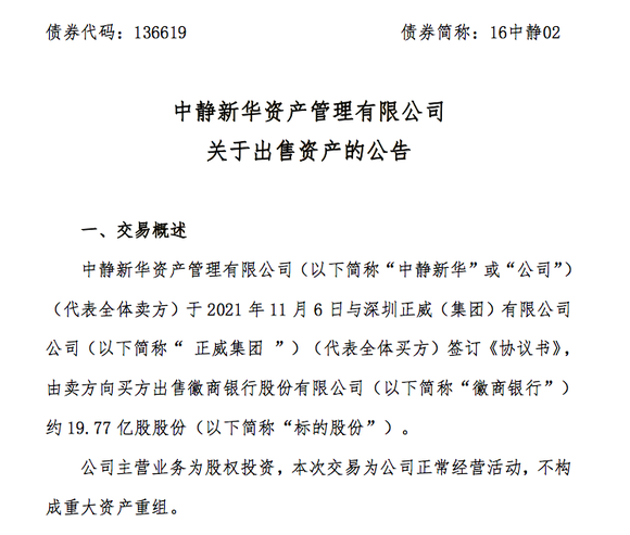 11月9日,作为“16 中静 02”公司债券的发行人,中静新华资产管理有限公司(下称中静新华)公告称,中静新华(代表全体卖方)于2021年11月6日与深圳正威(集团)有限公司(下称正威集团 )(代表全体买方)签订《协议书》,由卖方向买方出售徽商银行(03698.HK)约19.77亿股股份。