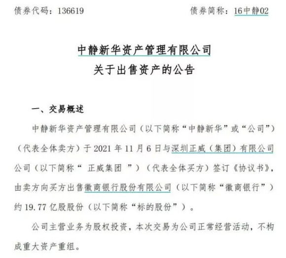 11月6日,卖方中静新华资产管理有限公司(下称“中静新华”)与买方正威集团签订《协议书》,前者出售徽商银行约19.77亿股股份(包含内资股及H股),转让总价高达160亿元,约折合8.1元/股。