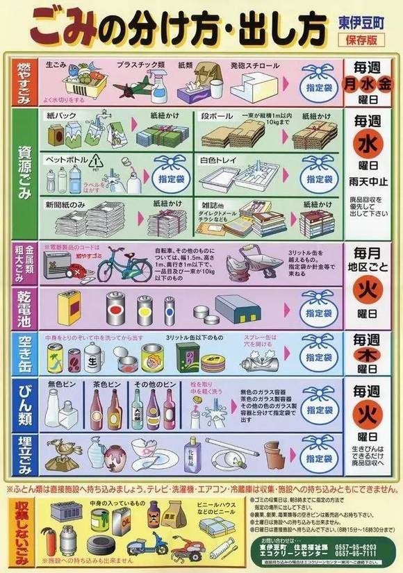 日本每个社区有自己的垃圾分类资料,一般是彩页海报,也有长达几十页的手册。规定了什么是可燃垃圾,不可燃垃圾,粗大垃圾,资源垃圾。每一个大类再细分若干小类,图示了清洗方法,分解方法,捆扎方法,以及粗大垃圾的收费标准,具体到每样物品都有回收价格。不少外国人快被这种近乎变态的分类方式吓哭了,而且非常不习惯扔垃圾还要花钱。这种分类意识是从幼儿园就开始灌输给孩子了,小学生喝完牛奶,会自己洗干净纸盒,通风干燥,第二天再剪开回收。一个喝完的饮料瓶子,要经过水洗,去瓶盖,撕标签,踩扁,分别丢弃的五个步骤。
