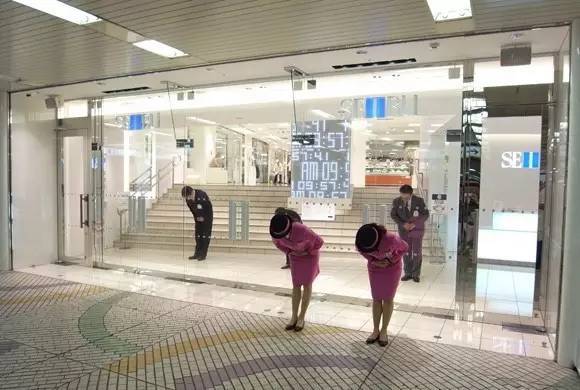 不光是高岛屋,三越这种高级百货商场,普通如永旺超市,每天开门时间也精确到秒,当顾客在门口等着进店的时候,所有服务人员和店长准时守候在里面,看着秒针指向开门时间,低头迎接第一批客人。每天营业结束后,店长也会在最后几分钟,向客人一一鞠躬感谢告别。