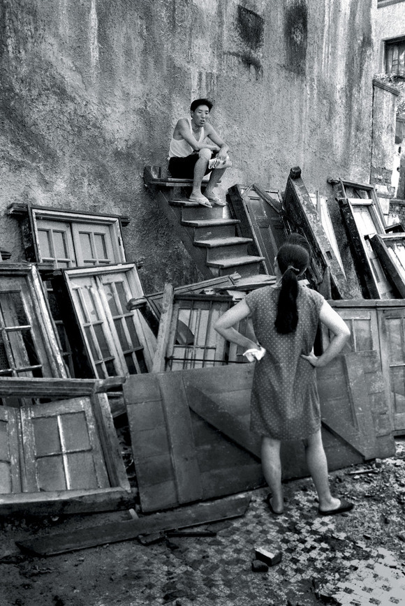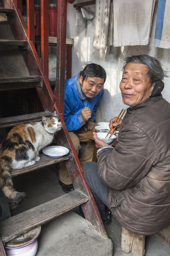书中最动人的部分或许是这座城市里普通人的日常生活。刘香成印象最深刻的照片之一是一张拍摄于2010年的照片:在老城厢乔家路,两位上海爷叔围着楼梯旁的一张小桌子吃饭,一只花狸猫蹲在楼梯上,从它面前的饭碗抬起头来。“不同年代的人面对的是不同的问题,住房当然是其中之一。虽然90年代初改革开放就如火如荼地展开了,但(对部分人来说)一些生活条件和物质环境依然如故。”