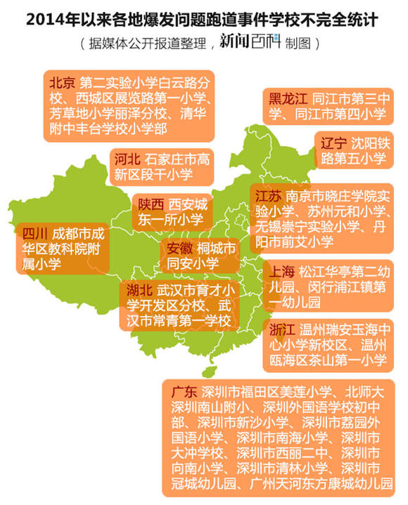 事实上,从去年9月份开学,江苏苏州元和小学最早爆出“毒跑道”事件以来,全国各地不断遭遇“毒跑道”危机。