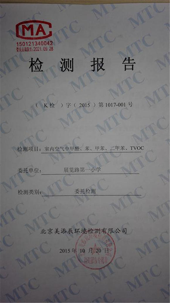 探针进行梳理发现,展一小室内环境监测分两次进行,第一次于2015年8月25日取样,委托类型为南通启益建设集团有限公司竣工验收,由北京中环天成环境监测公司提供检测服务。第二次于2016年10月17日取样,由北京美添辰环境监测公司提供服务。两家公司检测结果均显示室内环境质量正常,甚至第二次随机抽样数据低于第一次检测。