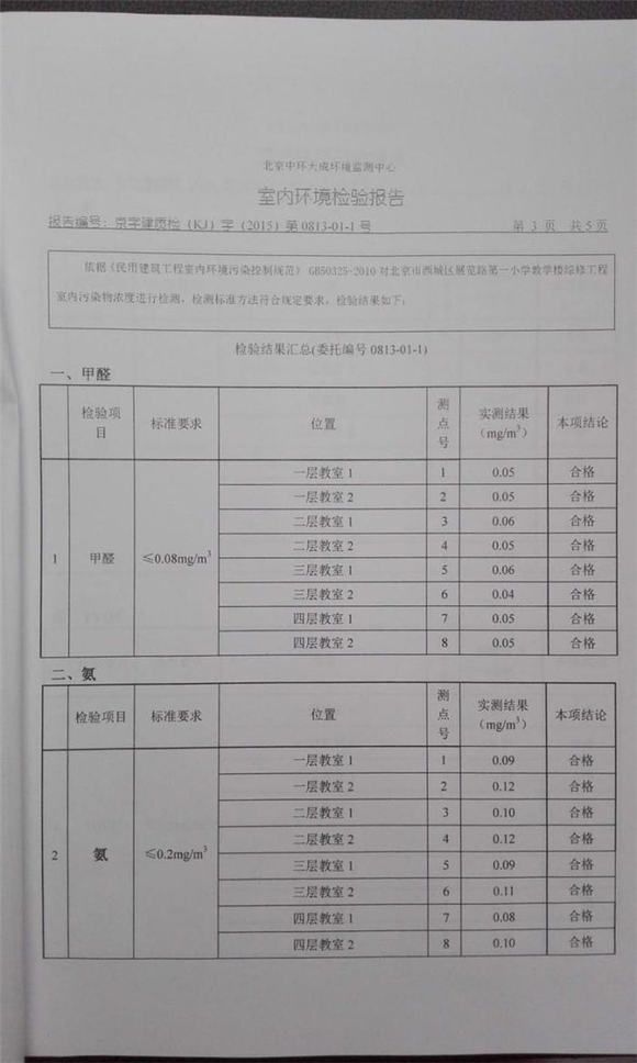 但是,两次检测依据标准略有不同,以甲醛含量为例,北京中环天成环境监测公司标准为≤0.08㎎/立方米,北京美添辰环境监测公司检测标准为≤0.10㎎/立方米;苯含量前者为0.09㎎/立方米,后者为0.11㎎/立方米;而TVOC含量依据标准分别为0.50㎎/立方米,0.60㎎/立方米。北京美添辰提供标准全部高于北京中环天成。
