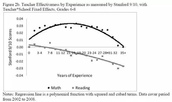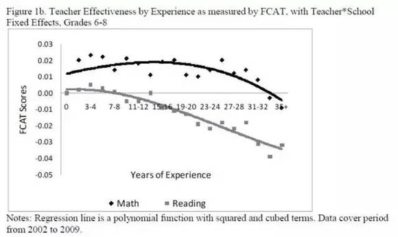 我们可以看到,以FCAT成绩为衡量标准,数学教师的效能在教学时长达到12年左右达到峰值,然后开始缓慢降低,而从20年左右开始急剧降低,而到33-34年左右降低到基准值以下。而阅读教师的效能则是从一开始保持2年左右开始缓慢降低,到7-8年左右就降到基准线以下。