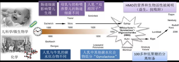 早在1886年,澳大利亚儿科医生和微生物学家Escherich就发现婴儿肠道中的细菌与消化功能存在联系。1900年,Moro和Tissier两位学者分别证实母乳喂养和人工喂养的婴儿粪便中细菌组成上存在差异。科学家们由此产生了一个大胆假设:母乳中是否存在造成婴儿肠道细菌不同的成分呢?这个假设在1926年得到了证实。Sch nfeld发现母乳的乳清中含有促进两歧双歧杆菌生长的促进因子。受到当时技术的局限,人们始终无法明确这个促进因子的真实身份。之后,法国科学家Polonowski和Lespagnol又从母乳乳清中检测到具有碳水化合物特征的组分,并命名为“gynolactose(乳寡糖)”。直到1954年,Gy rgy才证实了促使双歧杆菌增长的促进因子是一类低聚糖。同年,Polonowski和Montreuil两位科学家采用二维纸色谱分析法从乳寡糖中分离出低聚糖。