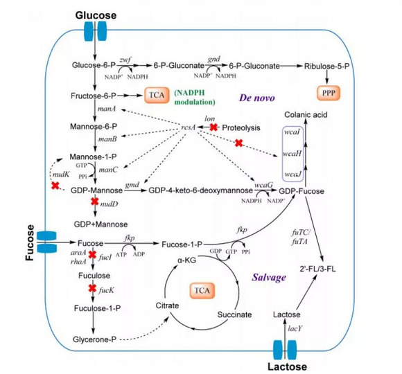 大肠杆菌工程菌生产2‘-FL/3-FL原理图。图片来源:ACS
