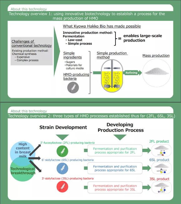 2020年11月,麒麟控股子公司协和发酵生物宣布:将在泰国开设一家新工厂用于HMOs的制造生产(2022 年夏季投入使用),届时将是世界首个达到工业标准的HMO生产系统。新工厂可生产三种微生物发酵HMOs,发别为 2’-FL(2'-岩藻糖基乳糖)、3’SL(3'-唾液酸乳糖)和 6’SL(6'-唾液酸乳糖),预计年产能达300吨,所生产的HMOs除了用于协和发酵及麒麟其他产品的开发,还计划供应给世界各地有需要的公司及科研单位。