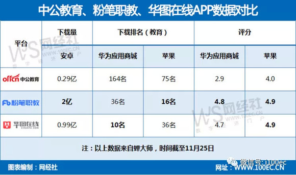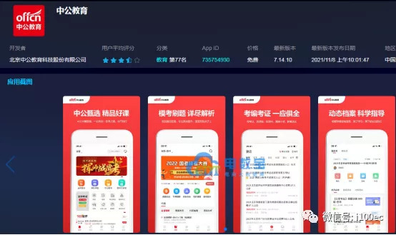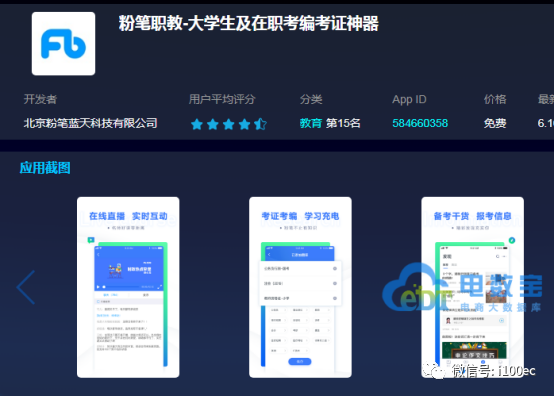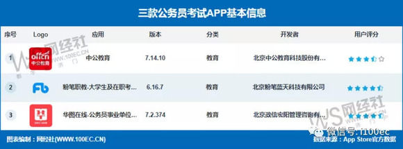 另外在苹果端,中公教育、粉笔职教、华图在线三款APP的教育(免费)行业排名分别为75名、16名、36名,评分分别为4.0、4.9、4.9。