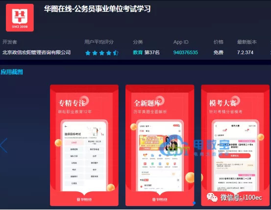 3)华图在线累计下载量超0.99亿,行业排名第10名,评分4.7;