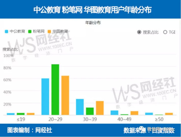 3)华图教育的用户年龄分布依次为:20-29岁(64.48%)、30-39岁(22.8%)、40-49岁(6.25%)、≥50岁(3.29%)、≤19岁(3.19%);