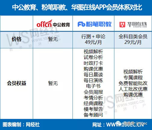 在商业模式上,中公教育、粉笔职教、华图在线三款应用均以线上课程为主,而粉笔职教、华图在线另有会员服务来实现商业变现,中公教育并无推出会员服务。