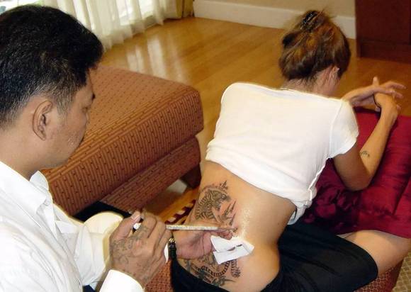 2001年,朱莉和她当时的丈夫比利鲍勃决心收养一个柬埔寨的孩子。过程也很曲折,当时相关协会发布了一份报告,揭露当地贫困家庭卖儿卖女甚至偷拐儿童以把他们卖给西方家庭。为了收养过程顺利,他们硬是停下了手头上的工作到处协商。好事多磨,2002年,安吉丽娜朱莉的第一个领养孩子-----马克多斯,终于来到了她的怀抱。2004年,她获得柬埔寨公民身份,为纪念这一刻,她请泰国纹身大师Sompong Kanphai 在后背纹上了一只孟加拉虎。