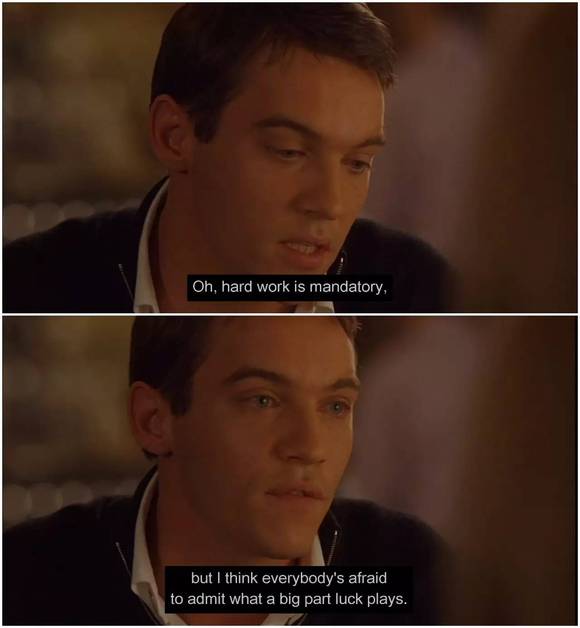 电影从一开始就强调“运气”在我们人生中的重要性。男主角克里斯的台词足以让我们把平时喝的几碗鸡汤抖一下:“努力工作固然重要,但我认为每个人都害怕承认运气有多重要。我是说,科学家们似乎越来越多地证明,所有存在的事物都是偶然发生的,没有目标,也没有设计。”