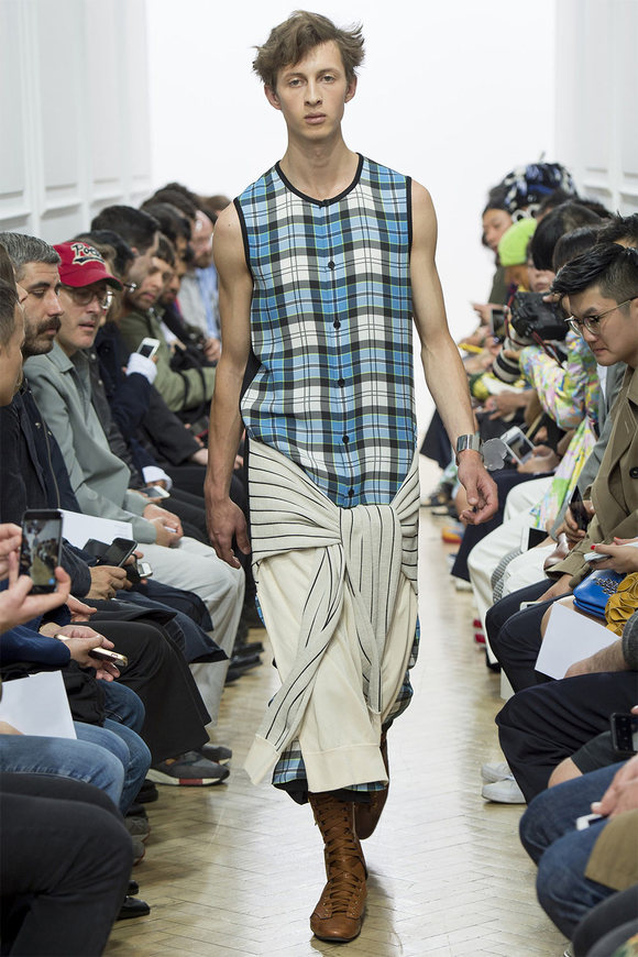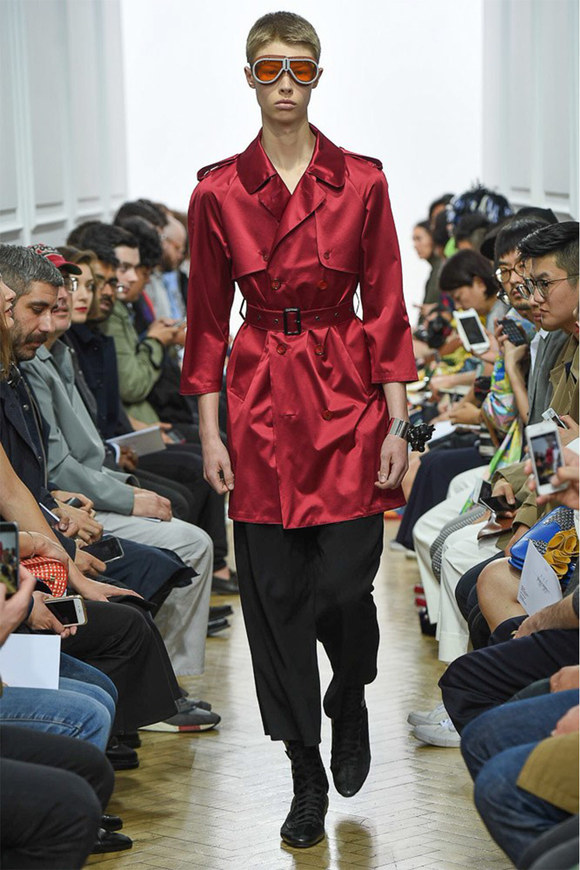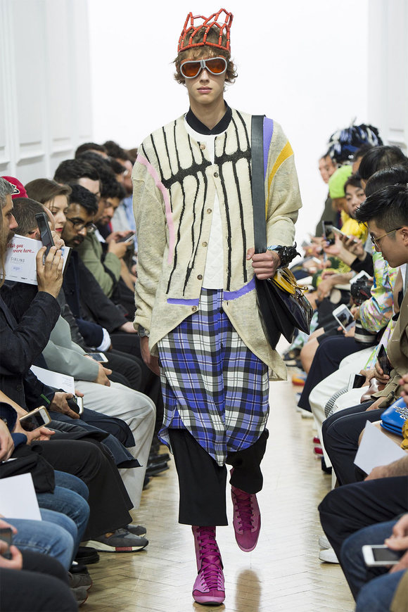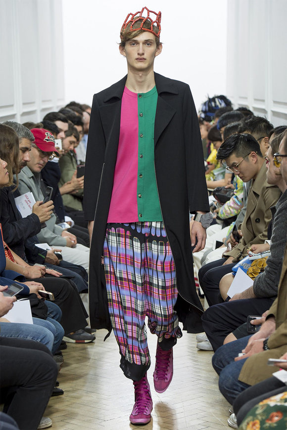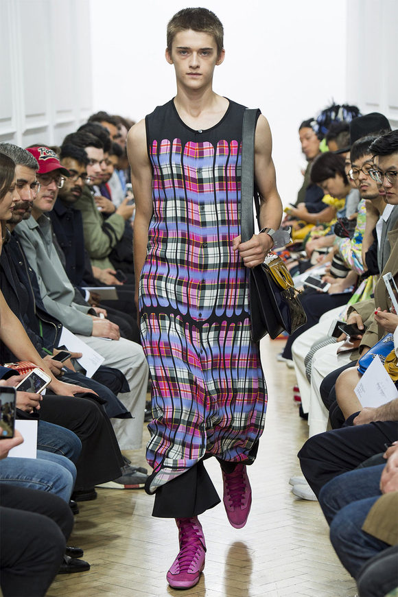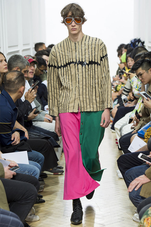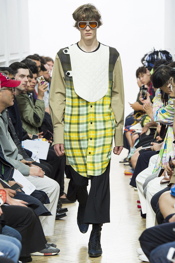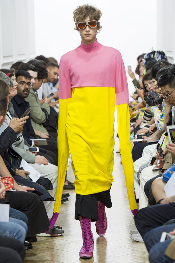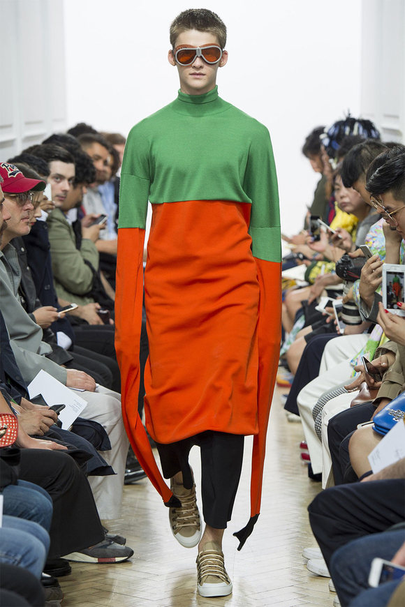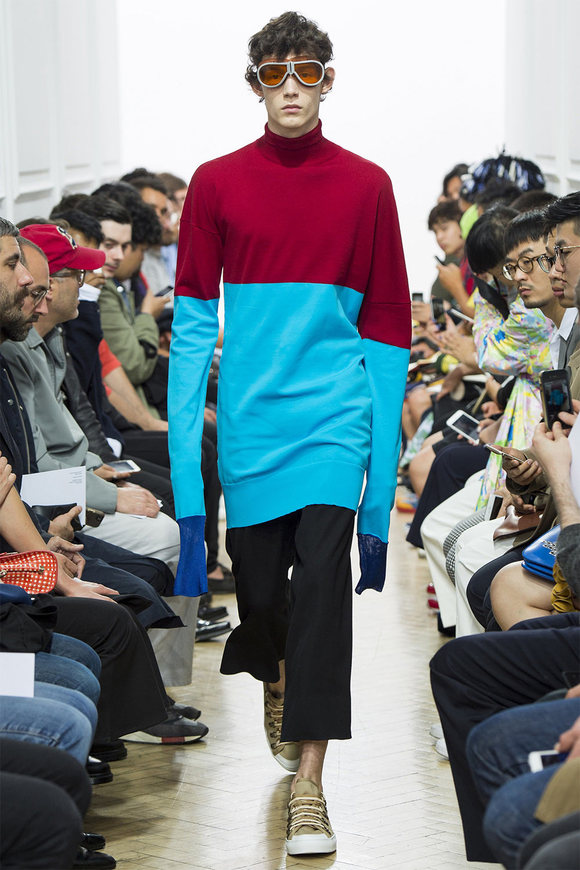 超长的袖子可能会引起某些人的嘲笑,因为在经历了Vetements爆炸式的蹿红后,你已经数不清有多少长袖子造型出现在伸展台上了——但给自己多一秒时间,你会发现J.W.Anderson的长袖罩衫并没有Vetements及其效仿者们那般带着如今被过度消费的次文化的晦涩影子。它很贴近“童话”这个主题,在炫目的色彩和重组的比例下,模特像是被魔法缩小后的人物,与之相配的背景音乐是来自知名秀场DJ Michel Gaubert挑选的David Bowie于1978年录制的普罗柯菲耶夫的交响童话《皮特与狼》的序幕曲——这使得“童话”的主题更具有代入感。