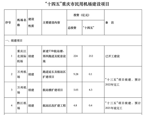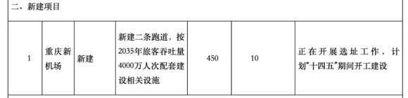 比如,规划提到重庆新机场的总投资为450亿元,其中“十四五”时期仅为10亿元。