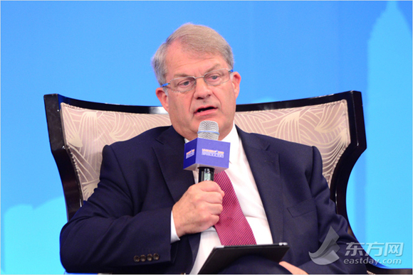 图为伦敦金融城政府政策与资源委员会主席Mark BOLEAT(图片来源:东方网)