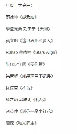 另外,在TMEA中,很多自媒体有意无意地忽视了另一个榜单,那就是“年度十大金曲排行”,这个榜单是这样的: