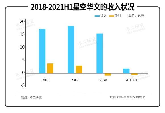 据其招股书显示, 2018-2021上半年,星空华文的收入分别为17.39亿元、18.07亿元、15.60亿元和1.55亿元;同期净利分别为4.76亿元、3.80亿元、-0.28亿元和-0.25亿元,从去年起由盈转亏。