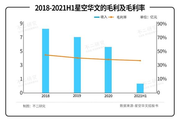 与此同时,毛利及毛利率的情况也不乐观。2018-2021上半年,星空华文的毛利分别为8.25亿元、7.05亿元、5.87亿元和0.57亿元;毛利率分别为47.5%、39.0%、37.7%和36.7%。