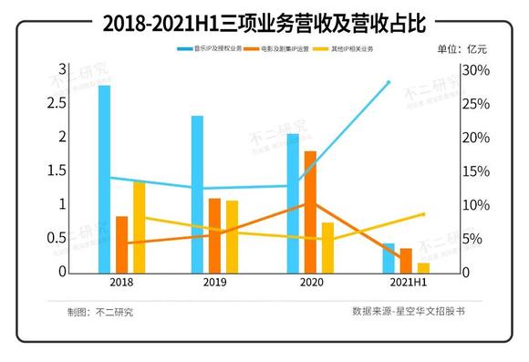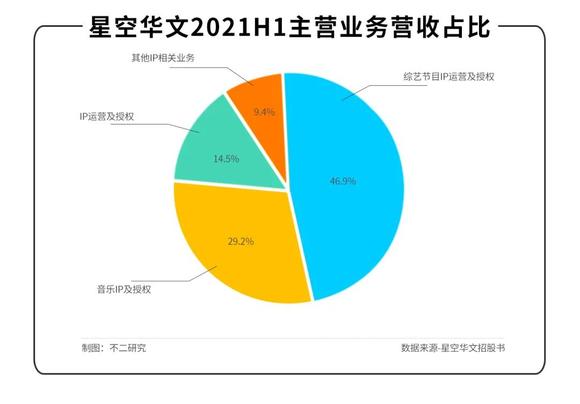 星空华文的主营业务分为综艺节目IP运营及授权、音乐IP及授权、电影及剧集IP运营及授权和其他IP相关业务。其营收在2021上半年分别占总营收比重46.9%、29.2%、14.5%和9.4%。