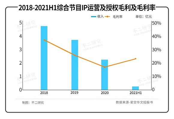「不二研究」发现,其主营业务综艺节目IP毛利率呈逐年下滑状态。2018-2021上半年分别为39.2%、27.6%、18.7%和23.4%,其中王牌节目《中国好声音》的收视率虽然较可观,但带来的收益却并不明显。
