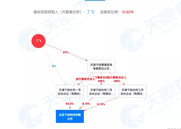 天眼查App显示,丁飞作为千挂科技的疑似实际控制人,最终受益股份为10.92%。