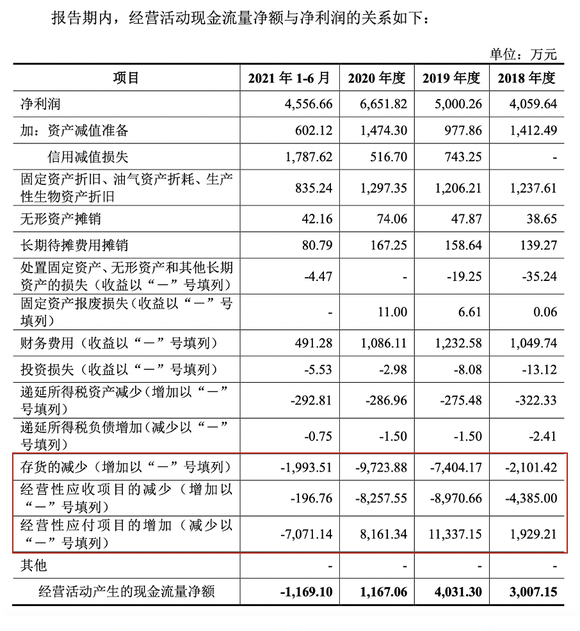 更进一步来说,存货、经营性应收项目以及经营性应付项目等直接对公司经营活动的现金流造成影响,报告期内公司经营活动产生的现金流量净额具有较大波动,分别为3007.15万元、4031.30万元、1167.06万元和-1169.10万元,同期净利润分别为4059.64万元、5000.26万元、6651.82万元和4556.66万元。