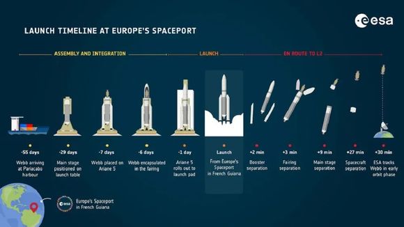 ▲韦布望远镜发射前和前30分钟发射过程(来源:欧洲航天局)