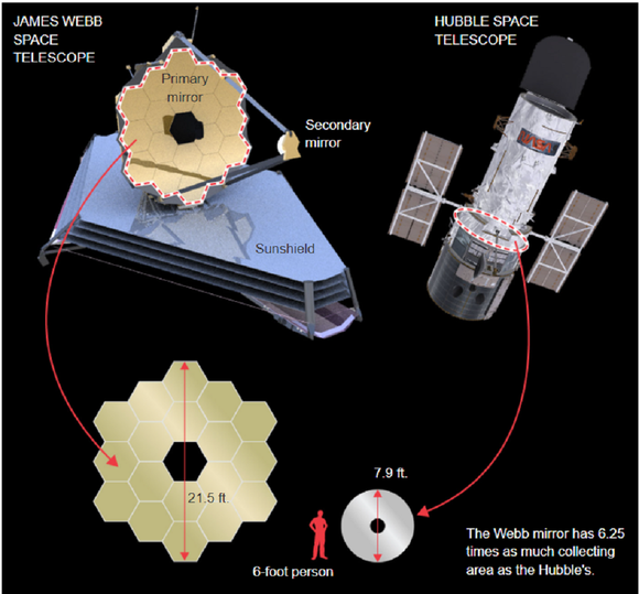 ▲韦布空间望远镜和哈勃空间望远镜的尺寸比较(来源:NASA)