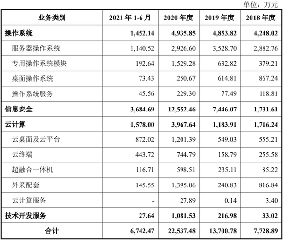 麒麟信安的主营业务为操作系统产品的研发和技术服务,延伸出信息安全、云计算等服务业务。招股书显示,麒麟信安2018年、2019年、2020年营业收入为0.8亿元、1.41亿元、2.31亿元,三年复合增长率为70.36%,2021年上半年营业收入为0.68亿元。