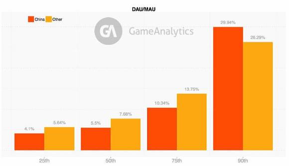从监测的三个月DAU/MAU比率(或粘性)对比来看,在前面第25天、第50天和第75天段,中国玩家的粘性要低于其他国家1%-4%。而在第90天段,中国玩家的粘性比其他玩家却高了大约4%。这种差异说明,尽管中国普通玩家的粘性较低,但是属于重度参与者的玩家群体粘性非常高。