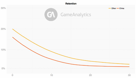 留存率曲线也反映了中国玩家的这种行为。从第20天开始,大部分的中国玩家会放弃游戏,留存接近于零,而留下的极少数玩家则是会较长时间活跃于游戏内的重度参与玩家。而其他国家的留存率在前面30天都是高于中国玩家大约2%,过了30天以后与中国玩家留存率越来越接近。