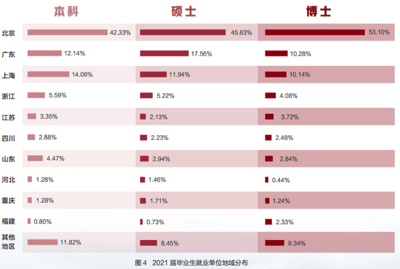 在所有毕业生就业省份中,“留京”仍是清北学子最主流的选择,尤其是博士生。清华、北大的2021届博士毕业生分别有55.9%、53.1%选择留在北京。
