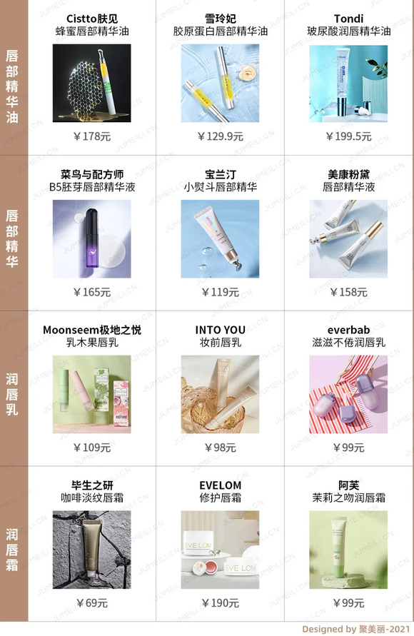 在淘宝等购物平台上搜索唇部护理产品,我们不难发现,唇部护理产品已经趋向面部护理化,出现了乳、霜、油、精华、面膜等质地。例如菜鸟与配方师推出了B5胚芽唇部精华液;Cistto肤见推出了蜂蜜唇部精华油;极地之悦、MIXX觅研等则推出了唇乳产品;毕生之研则推出了咖啡淡纹唇霜;宝兰汀推出了唇部精华和唇部磨砂等产品。