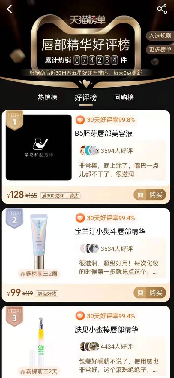 据了解,在唇部精华、护唇乳、护唇霜等类目下,不少国产品牌的存在感难以被忽视。例如天猫榜单唇部精华好评榜上,菜鸟与配方师的B5胚芽唇部美容液蝉联榜首1周,数据显示其月销量为3万+。此外,宝兰汀、肤见、aarye安野屋、戈戈舞等多个国产品牌上榜。