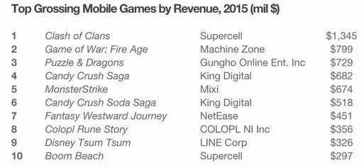 Supercell去年共上市3款游戏,款款重磅,而且自上市以来在前40大最卖座游戏排行榜上一待就是数年,其中2款还持续保持前十,尤其是其代表作“部落冲突(Clash of Clans)”自2012年上市后就长期霸占全球最卖座游戏前三。而今年初刚上市的第四款游戏“皇室冲突”又一次轻松拿下全美下载数最高且最卖座游戏的第一,并同时在44个国家排名第一。