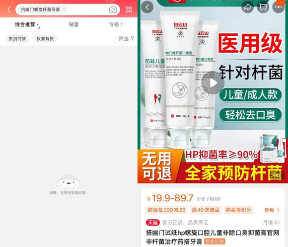 较高的感染者基数,再加上各种肠胃疾病乃至致癌的威胁,引发了消费者恐慌,不良商家却从中看到了商机。以“病从口入”,将牙膏与抗幽门螺杆菌组合,蹭起了这波细菌热度。