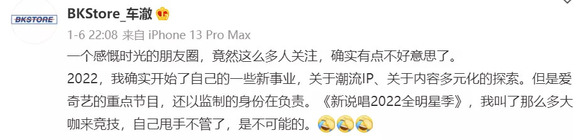 1月6日晚,车澈离职爱奇艺的朋友圈曝光,其后登顶微博热搜。消息曝出当晚,爱奇艺股价一度下跌6%。车澈在微博回应称,还会以监制身份负责《新说唱2022全明星季》,但确实开始了自己关于潮流IP、内容多元化探索的新事业。