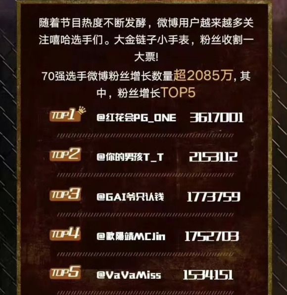 数据显示,截至2017年9月,《中国有嘻哈》主话题阅读量超过了70亿,热搜榜上榜次数461次,70强选手微博粉丝数增长2085万。