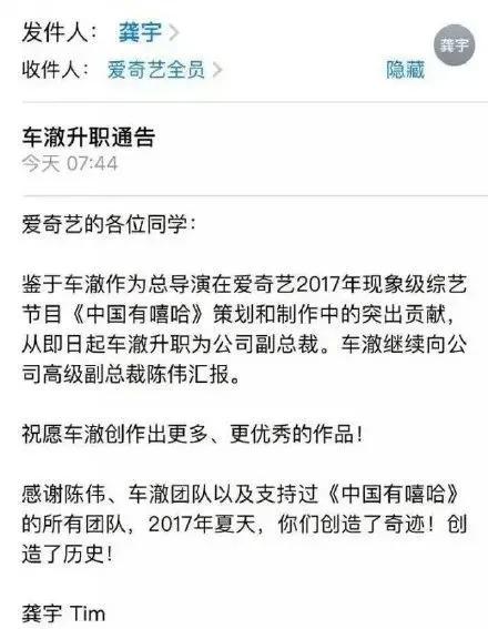 2017年9月,在《中国有嘻哈》收官,车澈正式升任爱奇艺副总裁。他赶上了爱奇艺自制综艺的好时候,也和青睐青年文化的爱奇艺不谋而合。